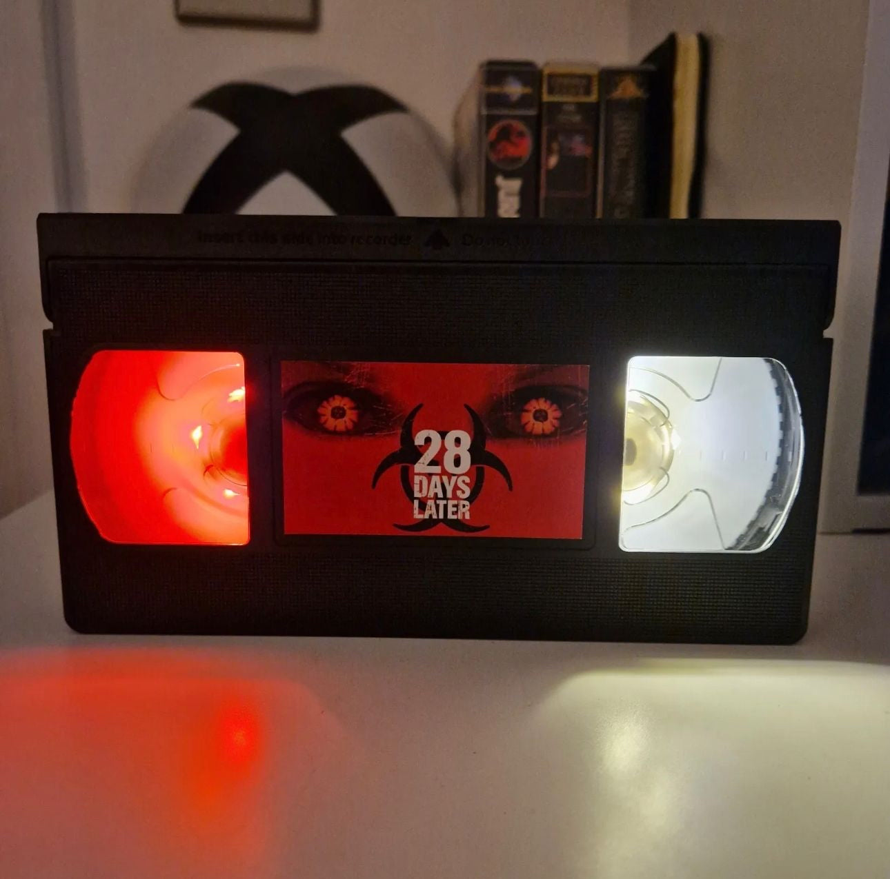 Created using a printed sticker on a spare or blank VHS tape converted into a LED VHS lamp.