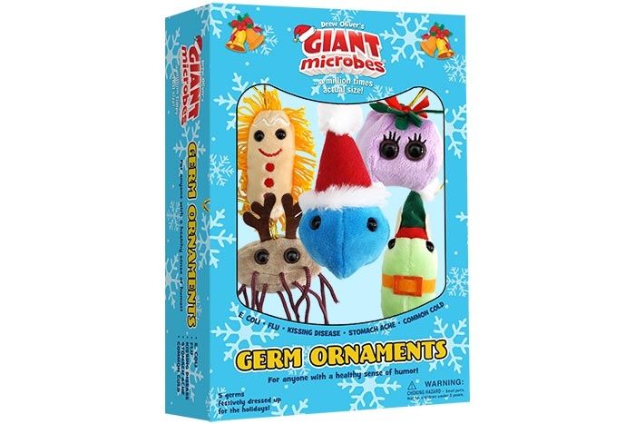 Germ Ornaments themed gift box includes: E. coli, Flu, Kissing Disease, Stomach Ache and Common Cold.