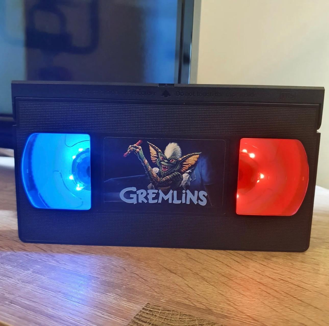 Created using a printed sticker on a spare or blank VHS tape converted into a LED VHS lamp.
