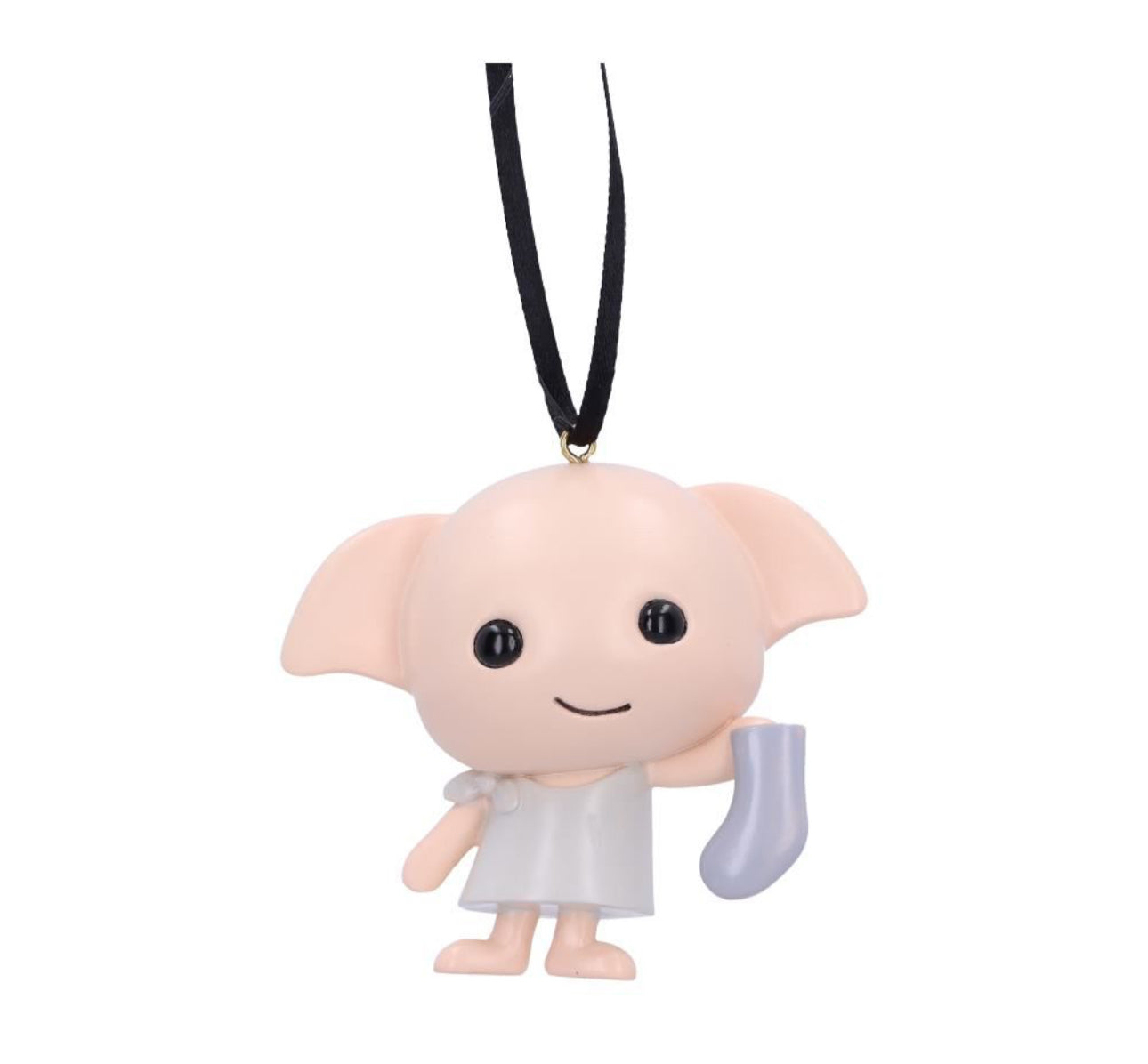 Potter Dobby Hanging Ornament. Here we have a cute Dobby dressed in his grey tunic holding his iconic sock in the air. Cast in the finest resin before being expertly hand-painted, this Dobby Hanging Ornament is ready to hang in any space.