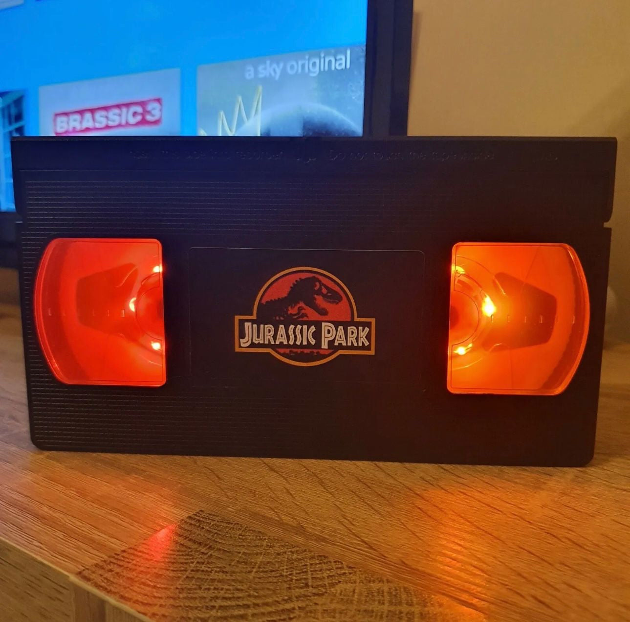 Created using a printed sticker on a spare or blank VHS tape converted into a LED VHS lamp.