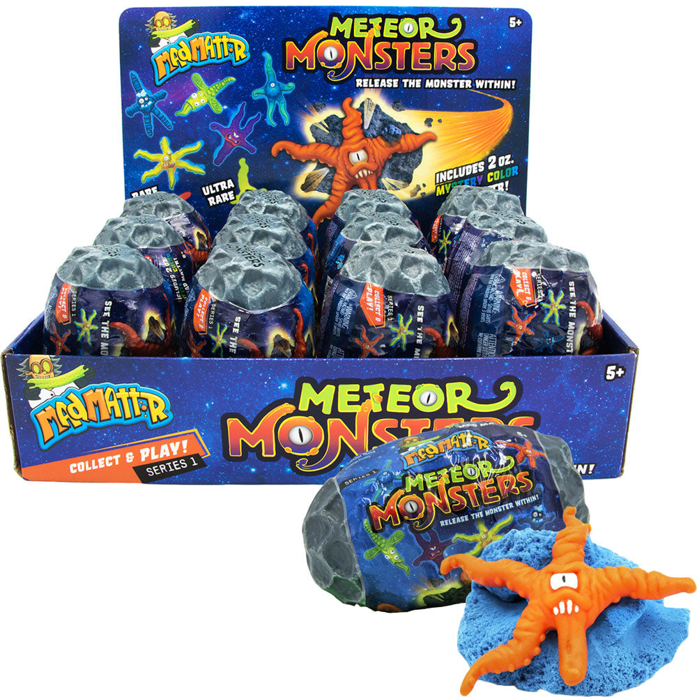 Release the monster within with Mad Mattr Meteor Monsters collectibles! This 2-in-1 blind pack features a chance to collect 8 monsters, including a rare and ultra-rare, and 6 colors of genuine Mad Mattr. Releasing the monster is easy as 1, 2, 3. Fill, twist, top off, smash and lift! Watch the monsters break out over and over. Challenge your friends and family! Includes 2oz mystery color of genuine Mad Mattr, a super-soft dough compound.