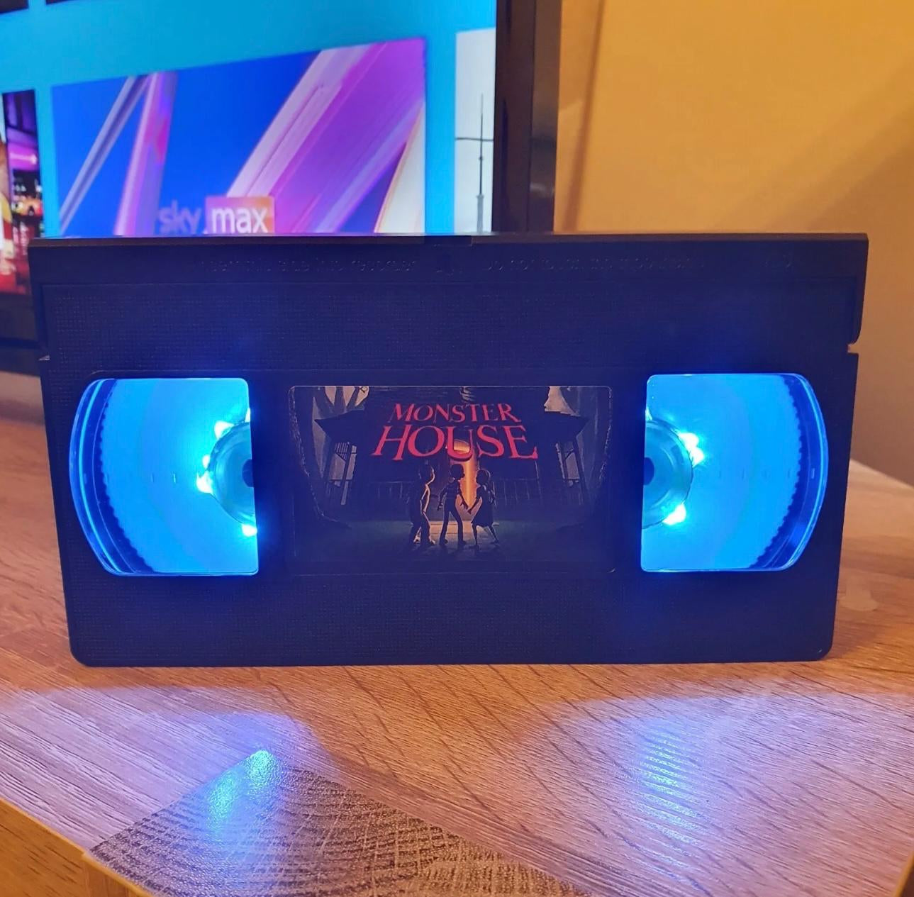 Created using a printed sticker on a spare or blank VHS tape converted into a LED VHS lamp.