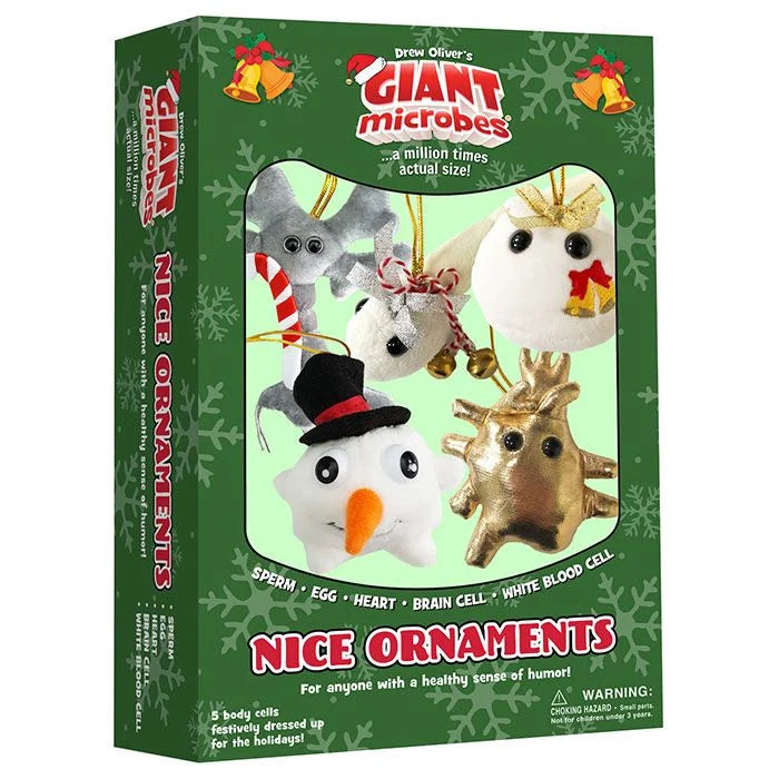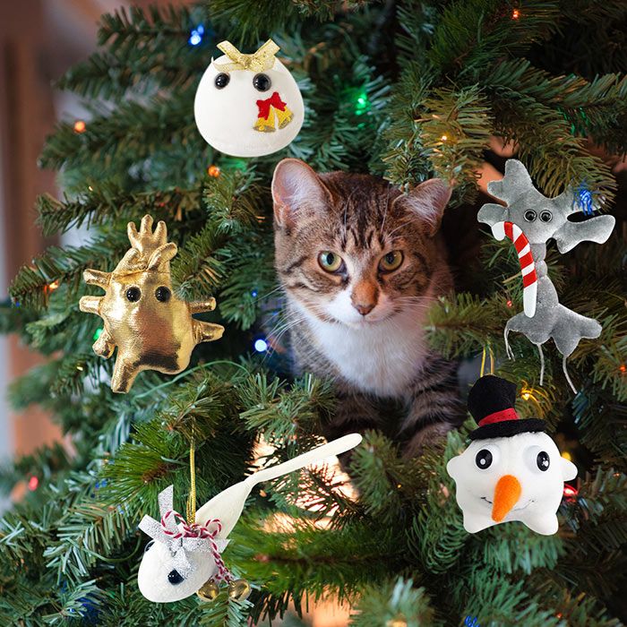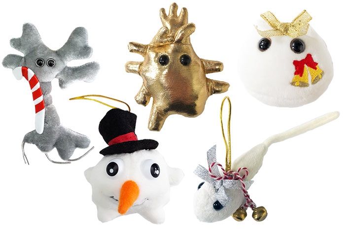 5 body cells festively dressed up for the holidays! Decorate your tree or house with these memorable special edition microbes with golden loops for hanging.