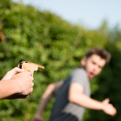 From the original makers. Fire one band at a time or pre-load five for rapid quick fire. Hand made from 100% replenishable wood. Comes complete with plenty of rubber band ammo. Colour Box.