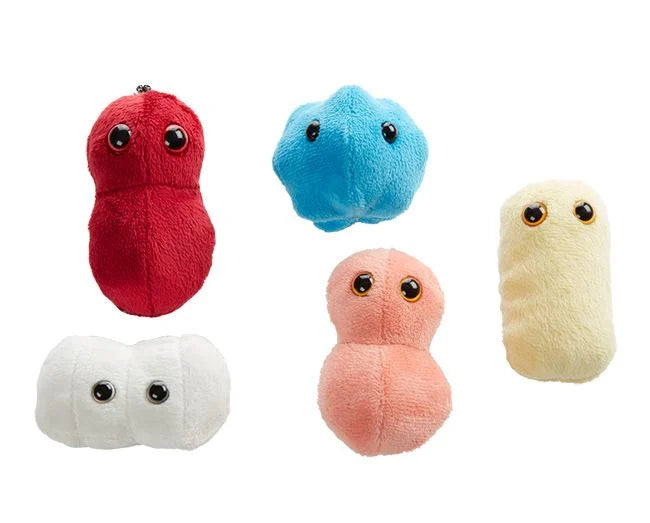 Sick Day themed gift box includes these mini microbes: Common Cold, Cough, Ear Ache, Sore Throat, and Cavity.