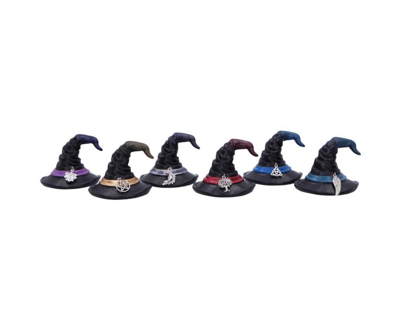 Each mini hat in the set features a distinct silver charm, from crescent moons to feathers, that represents various aspects of spiritual well-being and elemental balance. Made from high-quality resin, these hats exude quality and charm, making them perfect altar decorations, seasonal ornaments, or unique gifts. Their high-quality look adds to their allure, appealing to those drawn to authentic and symbolic items.