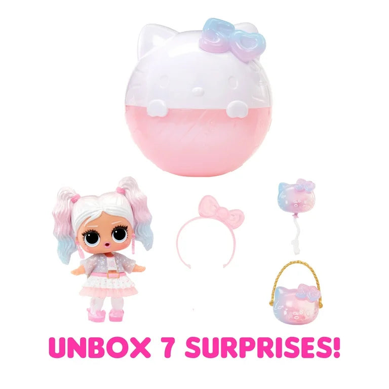 Introducing limited edition L. O. L. Surprise Loves Hello Kitty Tots! L. O. L. Surprise has partnered with the iconic Hello Kitty to celebrate her 50th anniversary and bring you limited-edition doll Miss Pearly, with adorable Hello Kitty-themed fashions and accessories, all in a brand-new Hello Kitty shaped L. O. L. Surprise ball! Unbox 7 shimmery, detailed surprises that match Hello Kitty's 50th anniversary celebration.
